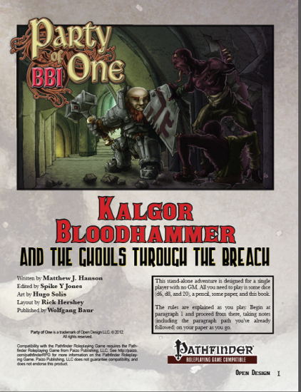 Recently I received a copy of a solo adventure for the Pathfinder Rules System. It follows the first exploits of a young Dwarf, Kalgor Bloodhammer, coming into his own. For those of us "seasoned citizens" who grew up